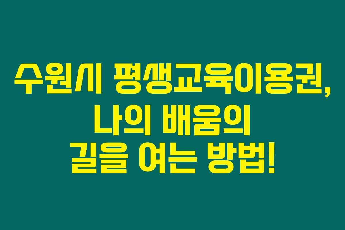 수원시 2025 평생교육 이용권은 정말 좋은 기회예요. 이 이용권을 통해 수많은 강좌들을 배울 수 있는 더 넓은 세상으로 나아가세요. 신청 방법을 잘 이해하고 조건을 갖춘다면, 여러분의 새로운 시작이 될 거예요. 배움은 늦지 않아요! 함께 새로운 경험을 해보아요.