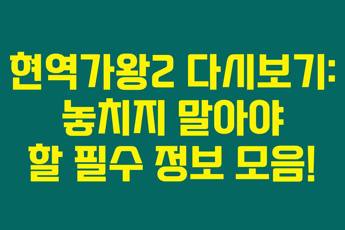 이 정보들을 통해 현역가왕2의 모든 것을 한눈에 확인하셨겠죠? 꼭 놓치지 말고 시청해보시길 바라며, 그동안 모았던 기대감이 뿌듯하게 채워질 거예요. 추가적으로 제가 소개한 OTT 무료 이용팁도 꼭 활용해보시고요!